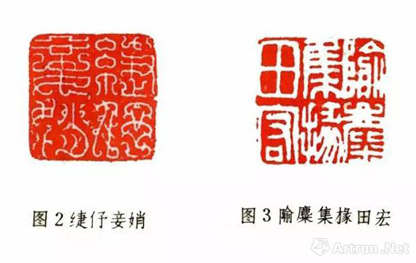 私印或連官職鑄刻。按其性質(zhì)仍是私印。傳世有漢代“【左“纟”,右“捷”字右部分】伃妾【左“女”,右“肖”】”玉印,便是一例(圖2)。魏武帝《選舉令》:“魏諸官印各以官為名印”,但這類印章傳世不多。顧氏《集古印譜》卷一收錄“裨將軍張賽”一印,《十鐘山房印舉》舉之二收錄“尚書散郎田邑”、“逾麋集掾田宏”(圖3)兩印,大約就是三國以后印。