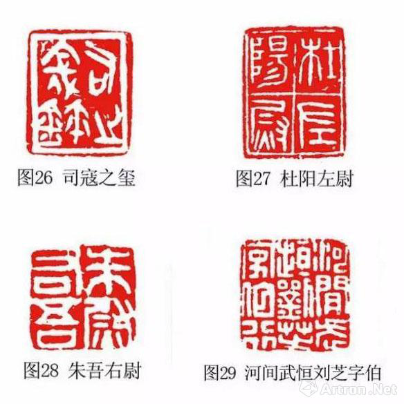 橫讀印如“司寇之璽”,“司寇”二字在上列,“之璽”二字在下列(圖26)。又如“杜陽左尉”,“杜陽”二字在上列,“左尉”二字在下列(圖27)。交錯(cuò)文印如“宜陽津印”,“陽”字在“津”字下,“津”字在“宜”字左,容易誤讀“宜印津陽”或誤讀“宜津陽印”。還有“朱吾右尉”,“吾”字在“右”字下,“右”字在“朱”字左,容易誤讀“朱尉右吾”,或誤讀“朱右吾尉”(圖28)。以上兩種印文甚少見。